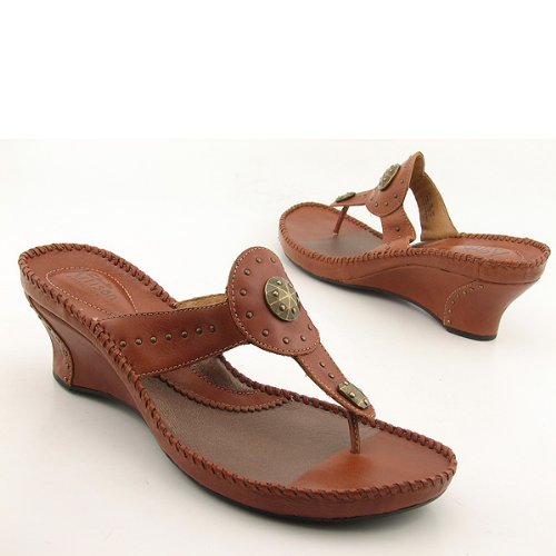 Clarks Shingo Cognac sandals Clarks *Shingo* leather high heel sandals. Contrast stitch detailing. Decorative ornament. Whipstitch detail. Antiqued gold-tone hardware. Antiqued gold-tone studs. Covered wedge heel. Cushioned insole. Leather lining. Non-slip rubber sole.0 ...
