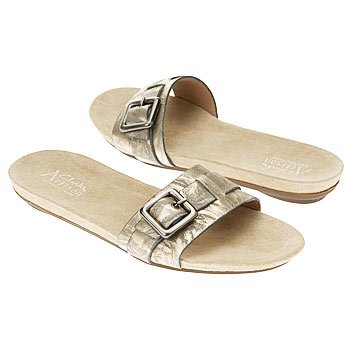 Clarks *Forget Me Not* leather sandals. Silver-tone buckle. Decorative pattern. Decorative strap detail. Open toe design. Shimmer finish. Man-made heel. Cushioned insole. Non-slip, man-made sole.