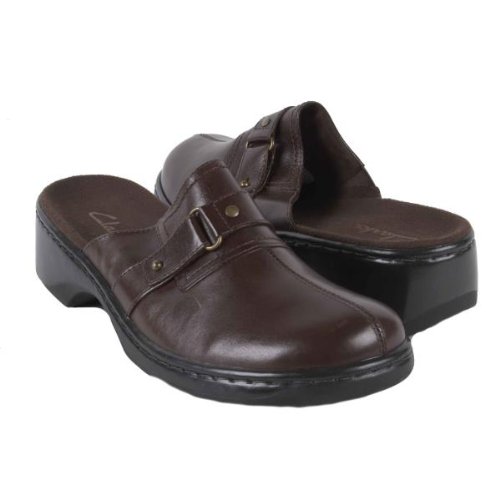 Clarks *Cherry* leather mules. Needle stitch and decorative strap detail. Elastic side gore. Antiqued gold-tone hardware. Antiqued gold-tone studs. Rounded toe design. Man-made heel. Cushioned insole. Fabric lined. Man-made sole.