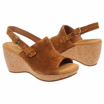 Add an appealing look to your wardrobe with the Clarks England Harwich Middy platform sandal. Leather upper with center stitch vamp detail in a slingback style sandal with a round peep toe. Soft leather ankle with an adjustable buckle closure. Contoured footbed is lined with breathable leather. 1 inch platform midsole. 3 1/2 inch cork-wrapped wedge heel.